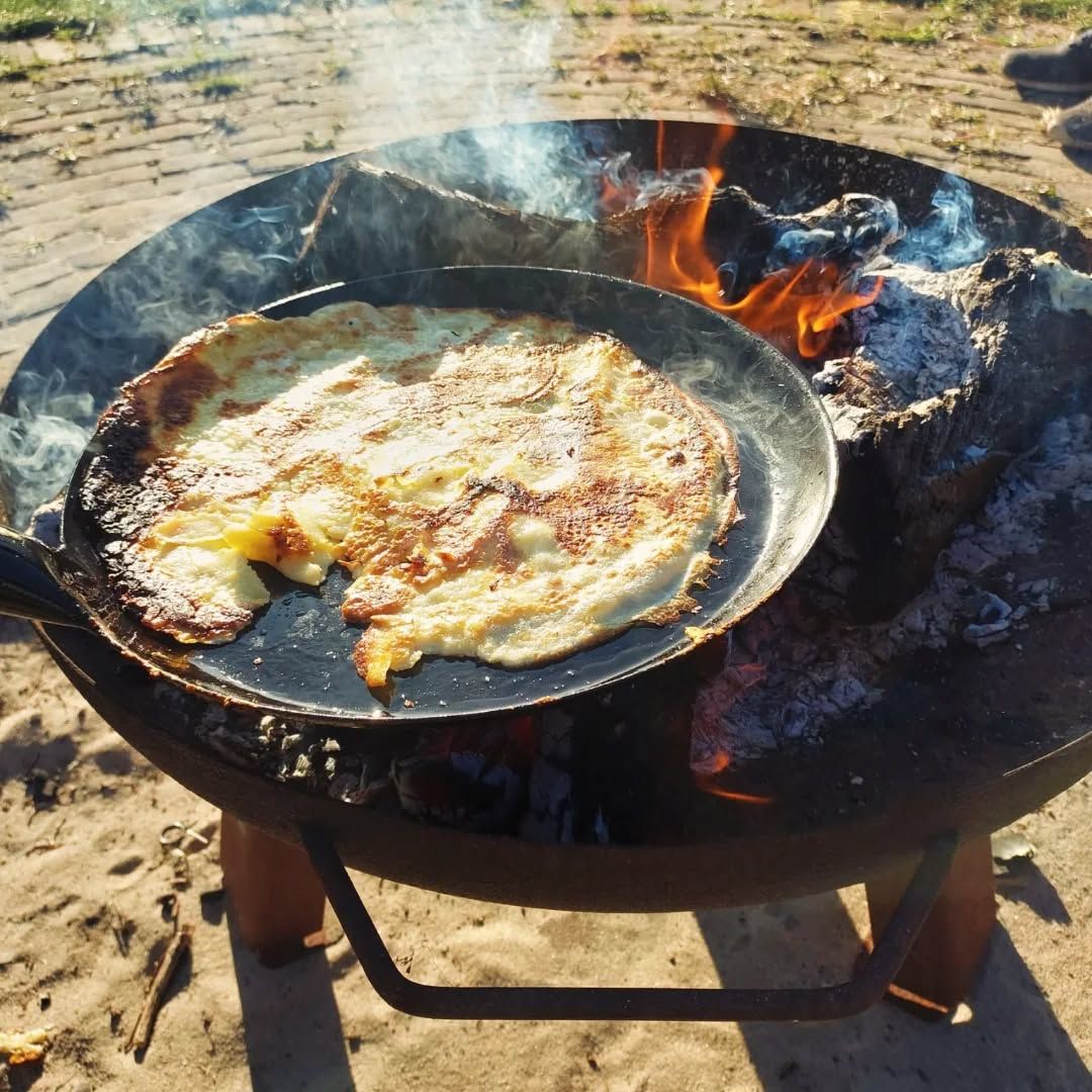 Beleef de charme van buiten koken en bak je eigen pannenkoeken boven een knisperend (zelfgestookt) vuurtje! Met een speciale pan op lange steel sta je gezellig rond het vuur terwijl het beslag langzaam verandert in een goudbruine pannenkoek. De geur van houtrook, het knetteren van het vuur en het plezier van zelf bakken, maken dit tot een unieke en smakelijke belevenis voor jong en oud!